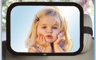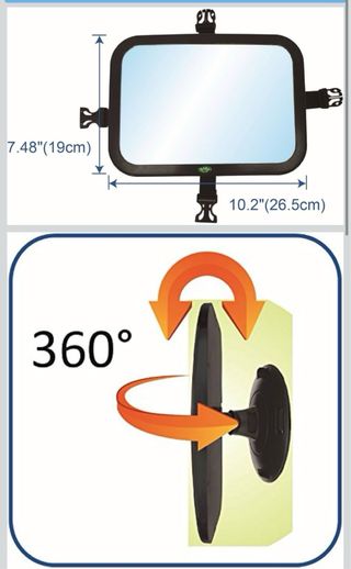 Espejo para coche diseñado para vigilar al bebé. Es de gran tamaño y forma rectangular. - Marco negro. - Correa de sujeción. - Diseño seguro para el coche. 26 x 19 cm