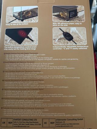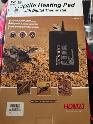 Manta calefactora para terrarios de reptiles con termostato digital. Diseñada para proporcionar calor sin luz. - Tamaño: 8x12 pulgadas (para tanques de 30-40 galones). - Incluye termostato digital para control de temperatura. - Emite calor sin emitir luz.
