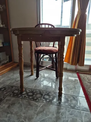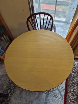 Mesa de comedor redonda con patas de madera. - Diseño clásico y elegante. - Acabado en tono madera natural. - Buen estado - Tiene cubierta redonda de madera Medidas: - Diametro: 86 cm - Alto: 77 cm