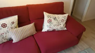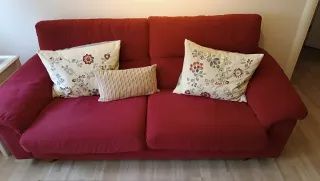 Cómodo sofá de tres plazas en color burdeos, perfecto para tu salón. Incluye de regalo dos cojines (55x40) decorativos con estampado floral. - Tapicería de tela. - Diseño moderno y acogedor. - Dos cojines a juego incluidos de regalo (55x40).