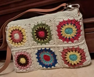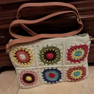Bolso artesanal de ganchillo con un diseño alegre y colorido. - Elaborado con hilo de algodón. - Motivos florales en cada cuadrado. - Correa ajustable de cuero.