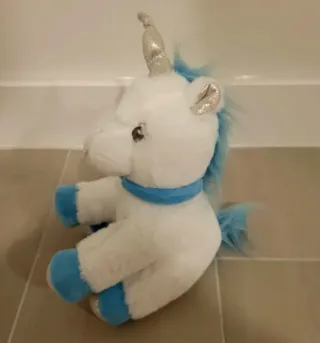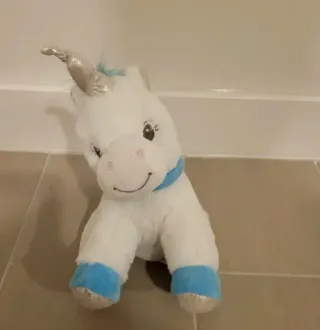 Adorable peluche de unicornio, perfecto para los amantes de la fantasía. - Color blanco con detalles azules y plateados. - Cuerno plateado brillante. - Melena y cola azules. - Bufanda azul alrededor del cuello.