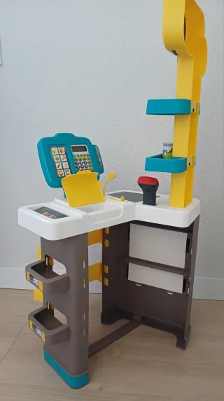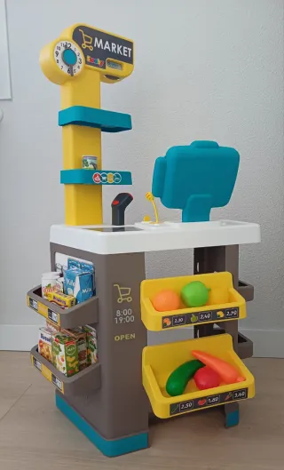 Divertido supermercado de juguete Smoby. - Incluye accesorios como frutas, verduras y productos de alimentación. - Tiene un escáner y una caja registradora con billetes y monedas. - Estructura de plástico resistente y colorida. - Con carrito de compra.