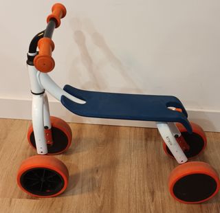 Bicicleta de aprendizaje 2 en 1 en color blanco y naranja. Ideal para los primeros desplazamientos. 3 posiciones de altura. Con marcas y rasguños propios del uso. Le falta una de las tapas de la rueda se ve en una de las fotos.