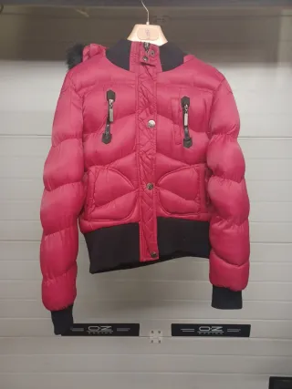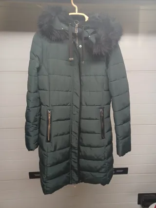 Cazadora acolchada de mujer con detalles modernos. - Capucha con pelo sintético. - Cremalleras decorativas en los bolsillos. - Diseño largo y acolchado. Talla S