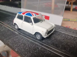 Réplica detallada de la marca welly de un coche Mini Cooper con diseño Union Jack. - Coche a escala entre 1/32 y 1/43 blanco. - Techo con diseño de la bandera Union Jack. Solo expuesto en vitrina