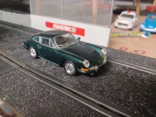 Coche a escala entre 1/32 y 1/43 de color verde oscuro. - Réplica detallada de un modelo porche 911 clásico de la marca welly expuesto solo en vitrina - Ruedas plateadas. - Ventanas transparentes.