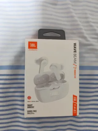 Auriculares inalámbricos JBL Wave Beam en color blanco. Disfruta de un sonido nítido y un ajuste perfecto. Vienen con su aplicación, tiene buena cancelación de ruido que además se la puedes cambiar en la aplicación. - Tecnología Smart Ambient. - Llamadas manos libres. - Hasta 32 horas de reproducción total. Están prácticamente nuevos se han usado muy poco 5 veces y funcionan perfectamente y la caja para cargarlos también.
