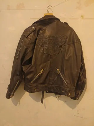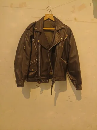 Auténtica cazadora motera de cuero de 1972. Un clásico con estilo. - Diseño motero icónico. - Material: Cuero. - Color: Negro - Forrada con tela de mapas - Cremalleras con aviones