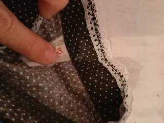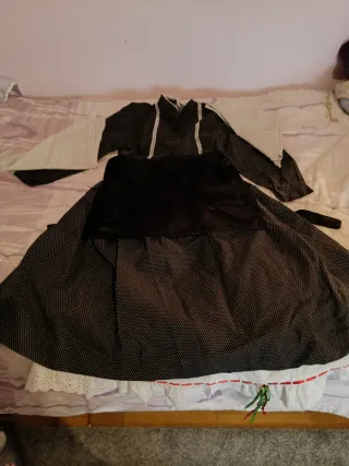 Conjunto de traje de casera con estampado de motas blancas sobre fondo negro. Incluye blusa,falda,delantal,enagua y dos pañuelos. - Diseño con cuello alto y detalles blancos. - Mangas largas con puños blancos. - Falda larga con delantal negro. - Bajo de la falda con encaje blanco.