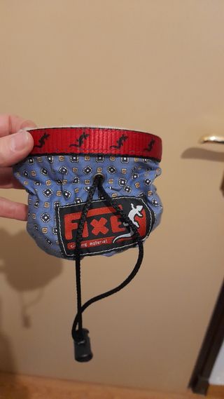 Magnesera para escalada de la marca FIXE. Tiene un diseño con estampado de rombos y un borde rojo con siluetas de lagartos. - Cierre con cordón ajustable. - Parche frontal con el logo de la marca y un lagarto. - Tejido exterior con estampado.