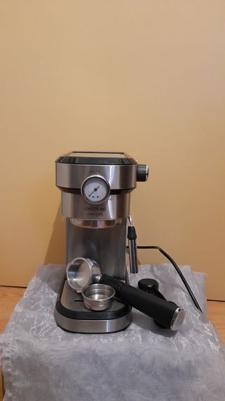 Cafetera express de la marca Cecotec, modelo Cafe Lizzia. Ideal para preparar café en casa. - Diseño moderno en acero inoxidable. - Manómetro para control de presión. - Incluye portafiltros y accesorio para vaporizador. - el deposito de agua es de plástico y tiene una esquina rota. Se ve en una de las fotos laterales