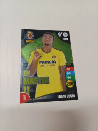 Cromo de fútbol de Logan Costa, jugador del Villarreal. Edición Panini. - Número 11. - Posición: DEF. - Puntuación: 230. - Atributos: 90, 80, 60.