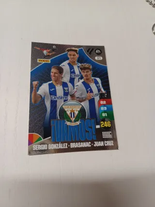 Coleccionable de fútbol de Panini. - Cromo número 371 de EA Sports. - Incluye a Sergio González, Brasanac y Juan Cruz. - Diseño con escudo del Club Deportivo Leganés.