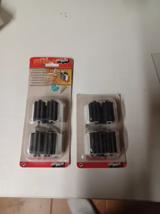 2 Pack de dos ganchos para colgar escobas y otros utensilios de limpieza. Son de la marca Brinox. - Material: Plástico y goma. - Color: Negro y rojo.