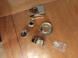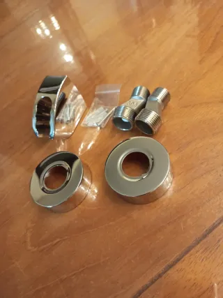 Conjunto de accesorios para ducha, incluyendo embellecedores para el grifo, con un par de excentricas de y un soporte para la alcachofa.