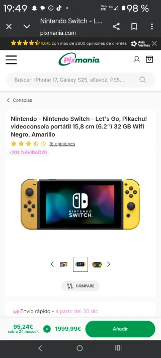 Consola Nintendo Switch edición especial Pokémon Let's Go Pikachu/Evoli. - Incluye mandos Joy-Con amarillos. - Incluye Pokéball Plus. - Sin juego.