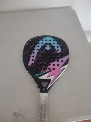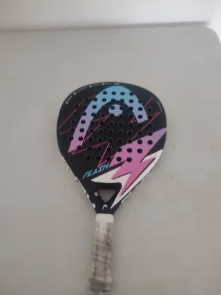 Pala de pádel HEAD Flash con un diseño llamativo. - Pala de pádel. - Diseño en negro con detalles en rosa, azul y blanco. - Logo de HEAD. - Nombre FLASH visible.