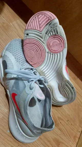 Zapatillas deportivas Nike SuperRep en tonos grises y detalles en rosa. Diseñadas para ofrecer comodidad y soporte. - Parte superior de malla transpirable. - Suela de goma duradera. - Cierre de cordones.