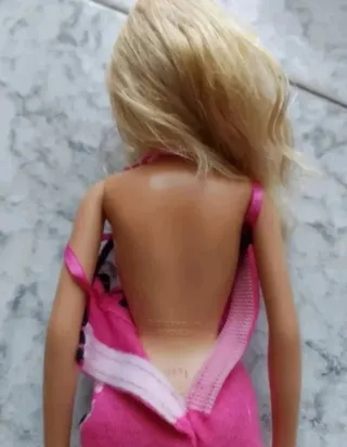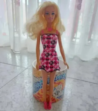 Muñeca Barbie clásica con cabello rubio y vestido rosa con estampado. Tengo más Barbies en mi perfil, comprando 2 las dejo en 5€. Entrega en Badalona Centro Comercial Magic,metro Gorg o La Salut.