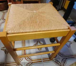 Taburete de madera maciza y mimbre con un diseño natural y práctico. - Base extraíble para mayor versatilidad. - Acabado en tonos beige y marrón. En muy buenas condiciones. Presenta pequeñas señales de uso como se aprecia en las fotografias. Medidas: Alto: 45 cm, ancho 40 cm, profundidad 40 cm