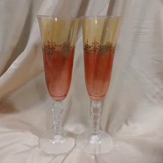 Conjunto de dos copas de cristal antiguas con un degradado de color rojo a amarillo. - Diseño con detalles decorativos en la parte superior. - Base y tallo con diseño de esferas. Preciosa pieza colección años 40. Medidas: Alto 22cm, diámetro boca 6cm, diámetro base 7cm