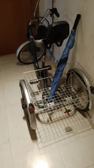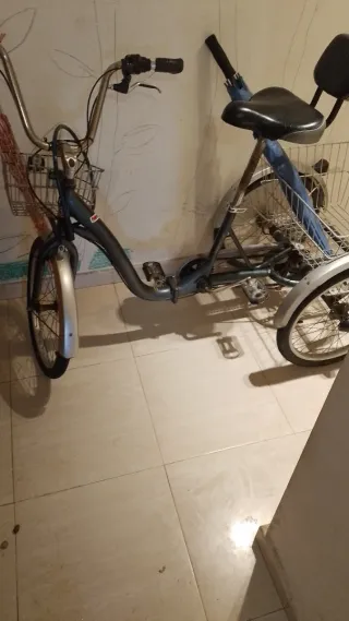 Triciclo de tres ruedas en color azul, ideal para paseos. - Cesta delantera para llevar objetos. - Asiento con respaldo. - Ruedas con radios.