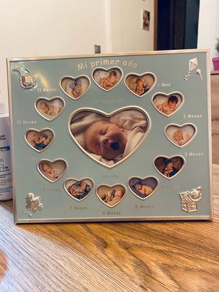 Marco de fotos para celebrar el primer año de un bebé, con espacio para 12 fotos mensuales y una central. - Diseño Mi primer año. - Incluye 12 espacios para fotos de meses (recién nacido, 1 mes, 2 meses, etc.). - Espacio central grande para una foto especial. - Decorado con motivos infantiles como un cochecito y cometas. Tiene un minigolpecito que ni se aprecia por delante solo es por atras y no afecta al funcionamiento