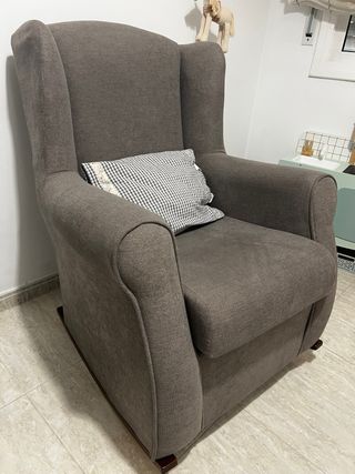 Mecedora cómoda y elegante, ideal para momentos de descanso y lactancia. Su diseño se adapta a cualquier espacio. - Tapicería de tela en color gris. - Base mecedora de madera.