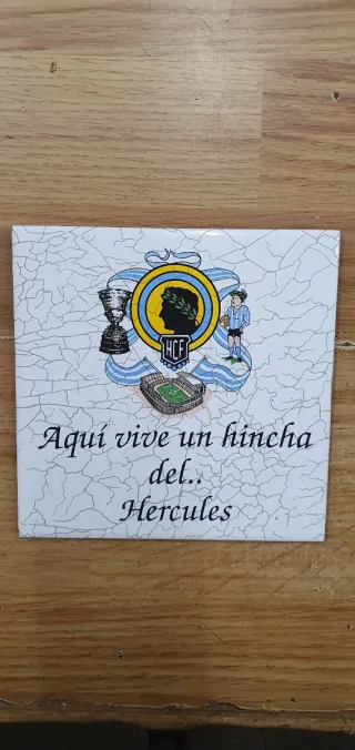 Azulejo decorativo con el escudo del Hércules y una frase. - Diseño con escudo del Hércules. - Texto: Aquí vive un hincha del... Hércules. - Motivos de fútbol y trofeo.