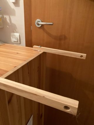 Mueble modular de madera de pino de IKEA, perfecto para organizar espacios. - Diseño escalonado con compartimentos. - Acabado natural de la madera. Se incorporó un acople para poder poner una barra para colgar los disfraces. Dispongo de cajas Trofast que se venden por separado