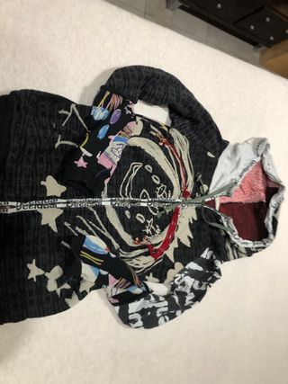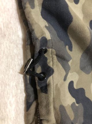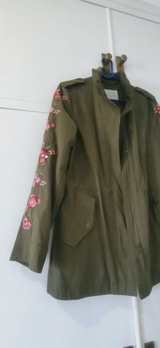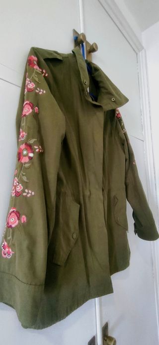 Talla M (medidas: 40cm hombros, 48cm sisa y 73cm largo), de algodón y poliéster, color verde oliva, bordado floral em ambas mangas en tonos verdes, rojos y rosas, cierre cremallera y corchetes, 2 bolsillos delanteros con solapa, cordón ajustable en la cintura y cuello tipo chimenea. Tacto suave y ligero, estilo urbano y casual. Apenas puesta, está perfecta.