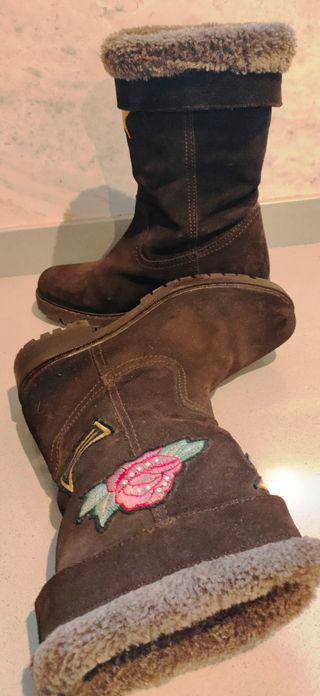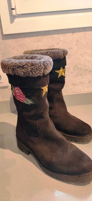 Botas o botines gamuza media caña en color marrón oscuro. Nº 38. Puntera redonda y suela gruesa y resistente de goma antideslizante, detalle de bordados flores y estrellas, forro interior térmico de pelo. Pocas puestas.
