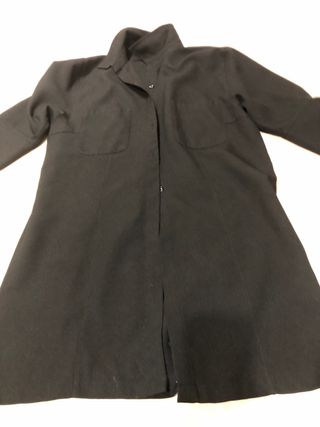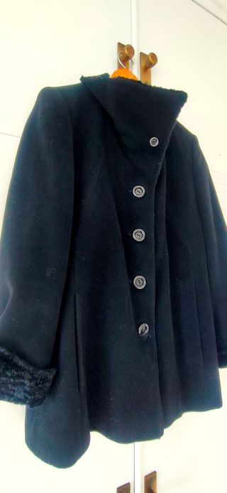 Talla 42/44 (medidas: 41cm hombros, 50cm sisa y 70cm largo), 60% angora, 30% lana y 10% cashemire, color negro con 5 botones delante, con solapas y puños de pelo corto, forro interior fino, 2 bolsillos verticales delanteros. De corte elegante y tacto suave, gustoso y cálido como de paño. Apenas puesto, está perfecto.