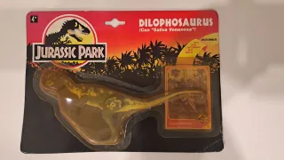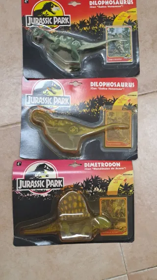 Lote de 3 figuras de dinosaurios de Jurassic Park de Kenner, en sus blisters originales. - Dilophosaurus con Saliva Venenosa. - Dilophosaurus con Saliva Venenosa. - Dimetrodon con Mandíbulas de Acero.