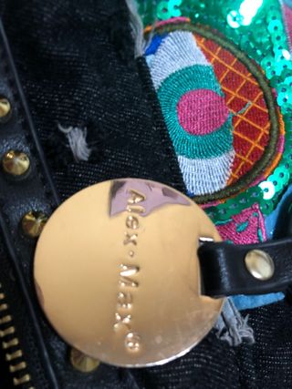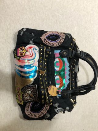 Bolso negro con un diseño único y llamativo, adornado con diversos parches. - Parche de helado con lentejuelas. - Parche de ojo. - Detalles de tachuelas doradas. - Cremalleras decorativas.