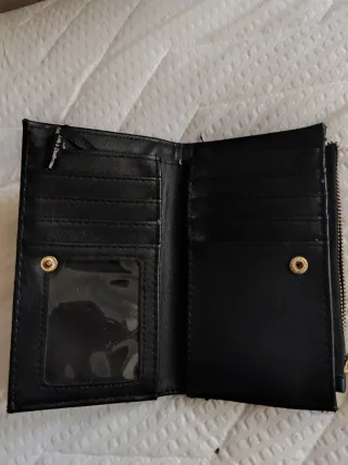 Monedero elegante con un diseño único. - Adornado con perlas y tachuelas doradas. - Cierre de cremallera.Le falta una perlita