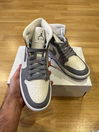 Zapatillas de caña alta Jordan 1 Mid en tonos gris y blanco. - Diseño icónico de Jordan. - Detalles en cuero sintético. - Suela de goma.