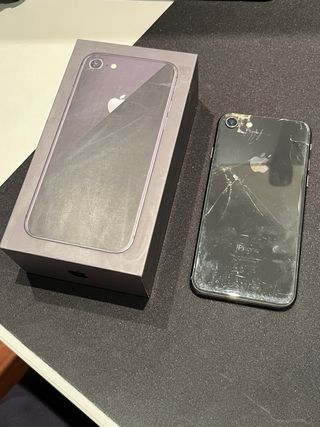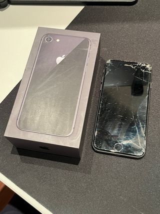 iPhone 8 con 64GB de almacenamiento. - Como se puede apreciar en las fotos tanto pantalla de delante como por la parte de atras estan roto pero no afecta en absoluto al uso, incluso la cámara no tiene problemas. - Es un movil que se usaba apenas una o dos veces a la semana. - Salud de Bateria al 82% Para mas información abrir por el chat