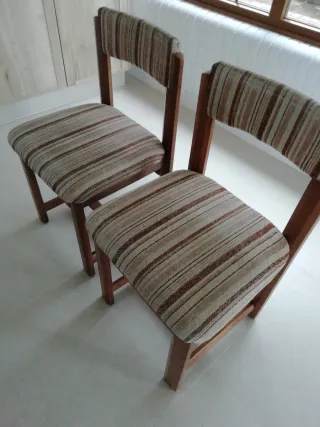 Conjunto de dos sillas de estilo vintage, perfectas para añadir un toque retro a tu hogar. Su diseño combina la calidez de la madera con un tapizado a rayas. - Estructura de madera. - Tapizado a rayas en tonos beige y marrón. Precio rebajado y final. No negociable. NO HAGO ENVÍOS