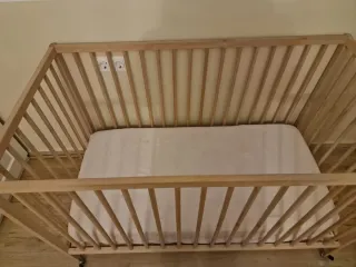 Cuna de bebé de madera de IKEA. Es un mueble infantil funcional y seguro. - Estructura de madera clara. - Barreras de seguridad. - Ruedas para facilitar el movimiento. - Incluye colchón de viscoelástica que tiene alguna marca del uso. - Incluye protectores y ropa de cuna.
