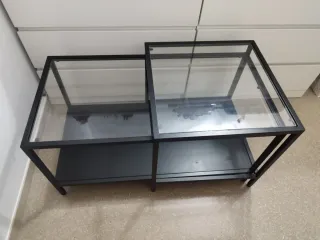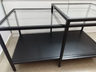 Conjunto de dos mesitas auxiliares de diseño moderno. 90×45 y 50 alto "Tiene alguna marca de uso" - Estructura metálica en color negro. - Superficie superior de cristal. - Diseño apilable o nido.