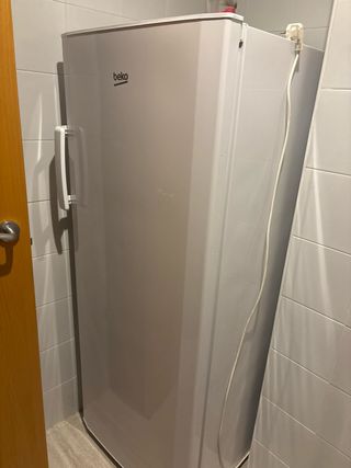 Congelador vertical de la marca Beko en color blanco. - Diseño moderno y funcional. - Tirador integrado. - Enchufe visible en la parte superior. -una tapa del cajon esta rota