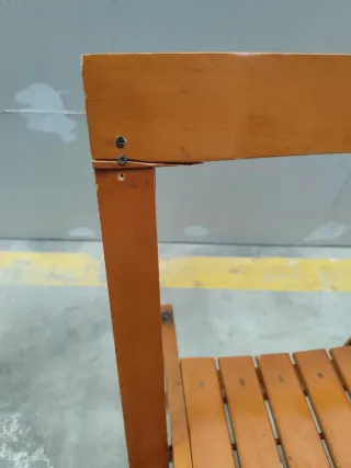 Silla de madera con un diseño clásico y funcional. Es fácil de plegar y guardar. Tiene un arreglo segun fotografía - Estructura de madera resistente. - Asiento y respaldo de listones.