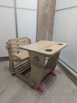 Pupitre infantil de madera MDF de 16 mm, para niños entre 2 y 4 años. Incluye dos huecos para vasos. Nosotros hemos añadido 2 cuñas antivuelco.