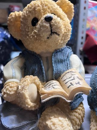 Adorable pareja de osos pintores, cada uno mide aproximadamente 21 cm. Son figuras decorativas con un diseño encantador. - Osos con suéter azul. - Incluye paleta de pintor y pincel. - Detalle de cubos con letras y figuras.