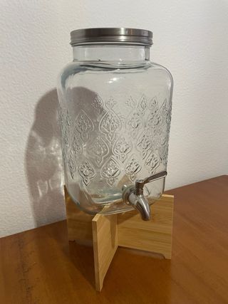 Dispensador de bebidas de cristal con un diseño grabado y grifo metálico. Perfecto para servir tus bebidas favoritas en reuniones o eventos. - Material: Vidrio y metal. - Diseño grabado. - Incluye grifo y soporte de madera - Tapa metálica - Capacidad 8 litros Medidas con el soporte 19x19x42 cm