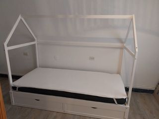 Estructura de cama para niño/a con diseño de casita y dos cajones. (Esta sin estrenar i se tiene que desmontar) - Incluye colchón de 90x190 cm. - Estructura de madera blanca. - Dos cajones integrados para almacenamiento.