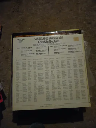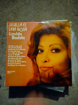 Disco de vinilo de Conchita Bautista titulado Sevilla es una Rosa. - Sevilla es una rosa - Viva Punta Umbria - Sevillanas de la Giralda - El alma del rocio - Las calles de Sevilla - Toros en Sevilla - Mi Plaza de Doña Elvira - Sevillanas del amor - Romería de Regla - El rincón de Santa Marta - Romería marinera - Sevillanas de la Alondra - Sello Belter Se escuchas ofertas