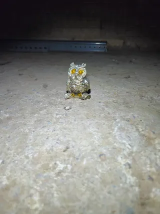 Pequeña escultura de un búho con detalles plateados y ojos amarillos. - Diseño detallado. - Acabado metálico.